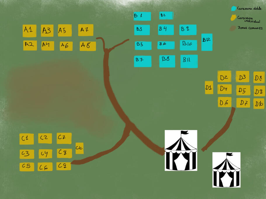 Zona amarillaCaravanas individuales. Todos tienen su propia caravana. Es un espacio infinito, lo que quiere decir que por dentro es más grande de lo que se ve por fuera. Cuenta con una pequeña cocina, un baño con ducha, salón y habitación.